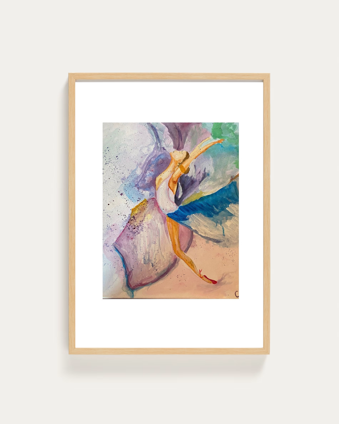 Cuadro decorativo realizado en acuarela sobre lienzo que captura la gracia y delicadeza de la danza. Sus suaves trazos y colores etéreos transmiten movimiento y elegancia, convirtiéndolo en una pieza artística ideal para salones, dormitorios o estudios creativos.