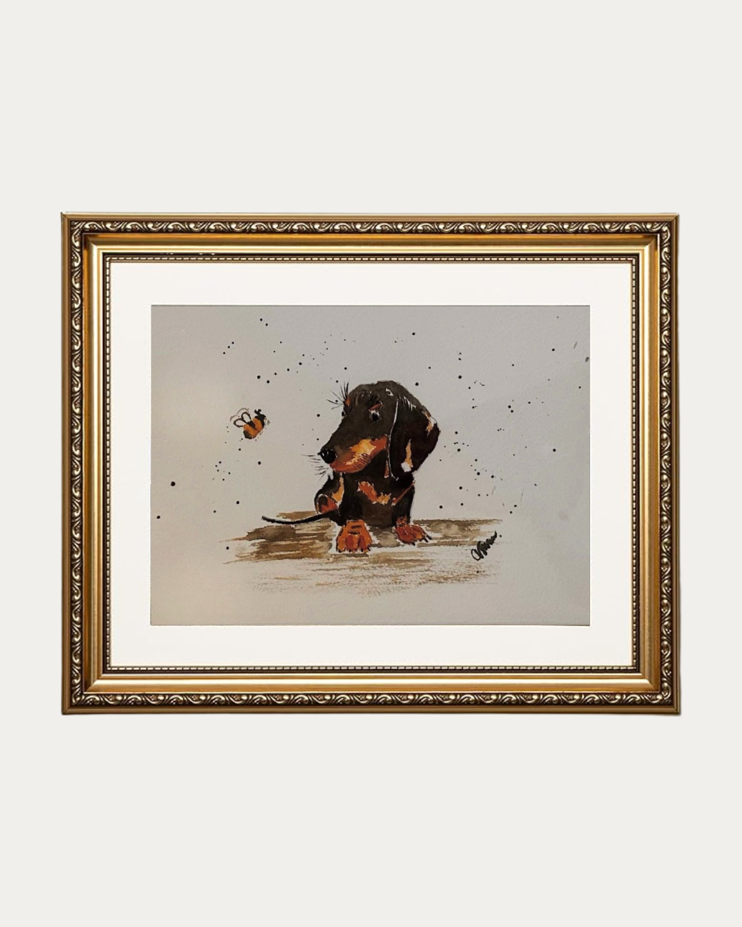 Cuadro decorativo realizado en acuarela que transmite calma y conexión entre el perro y su entorno. Sus trazos delicados y colores suaves capturan un momento lleno de ternura y armonía, aportando calidez y estilo a cualquier espacio del hogar.